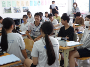 中3で総合的な学習の時間で取り組んでいる「ベトナム語講座」が大変盛り上がっています。2学期からは1・2組合同でハイ先生の講義を会話演習を交えながら楽しく学んでいます。