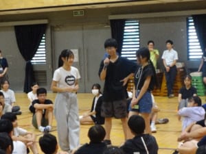 次に行われた3学年合同レクでは、同じカードを持つ仲間をジェスチャーだけで集めるレクリエーションに取り組みました。集まった各グループでは3年生が語る「受験で大変だったこと」や「中学校生活で思い出に残ったこと」に1~2年生が耳を傾けました。