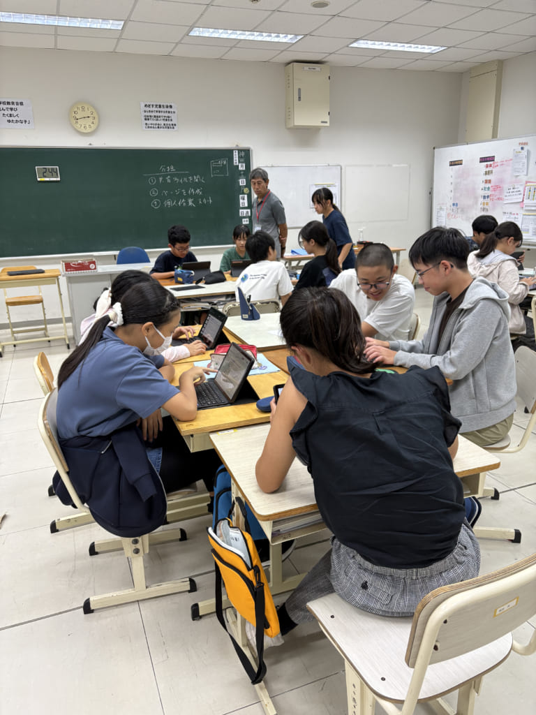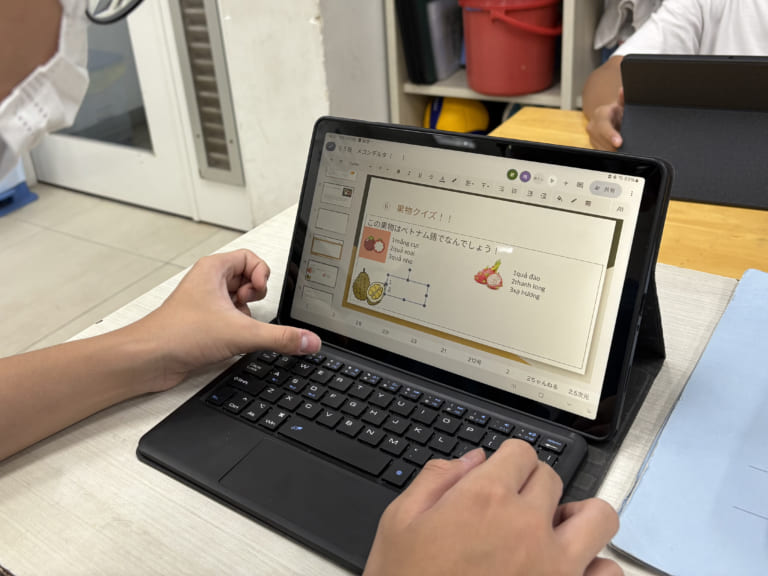 タブレット端末を使ったスライドづくりでは、写真やクイズを入れながら、相手に伝わるような発表を目指して作成する姿が見られました。