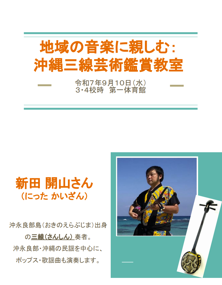 令和7年9月10日(水)、第1体育館にて、沖永良部島出身の三線奏者・新田開山さんをお招きし、3・4年生対象の芸術鑑賞教室を行いました。琉球文化圏に伝わる歌を地域ごとに紹介していただき、方言や「ありがとう」の言い方の違い、「ん」から始まる言葉が多いことなど文化の特徴にも触れました。みんなで新田さんの三線の演奏に合わせてエイサーを踊り、『てぃんさぐぬ花』を一緒に歌い、手踊りのカチャーシーにも挑戦しました。音と言葉、踊りのつながりを全身で感じ、身近に伝統文化を味わうことができました。この学びを運動会のエイサーにつなげられるよう、引き続き練習に励みます。