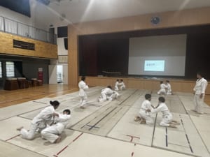 礼儀作法を重んじ、安全に注意しながら、「受け身」、「固め技」など基礎の技を中心に練習しています。