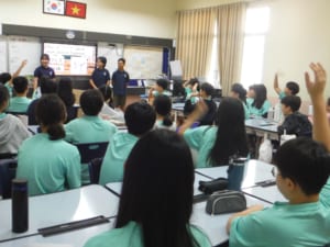 ホーチミン韓国人学校との英語イベントが行われました。6年生からは18名が韓国人学校を訪問し、「言語」をテーマにしたプレゼンテーションや、カードに日本語で名前を書いてプレゼントするアクティビティを行いました。学校に残った児童は他クラスの友達に向けてプレゼンテーションを行い、英語に親しむことができました。